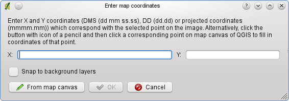 Щелкнуть мышью по точке на растровом изображении и нажать кнопку С карты для того, чтобы добавить координаты X и Y с помощью привязанной карты, уже загруженной в QGIS.