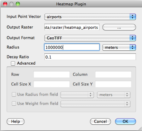 Радиус: указывается радиус буферной зоны вокруг точки, в качестве единиц измерения могут использоваться метры и единицы карты. Если радиус слишком мал, теплокарта получится некрасивой. В местах, где пересекается несколько буферных зон будет просто одна более яркая точка.