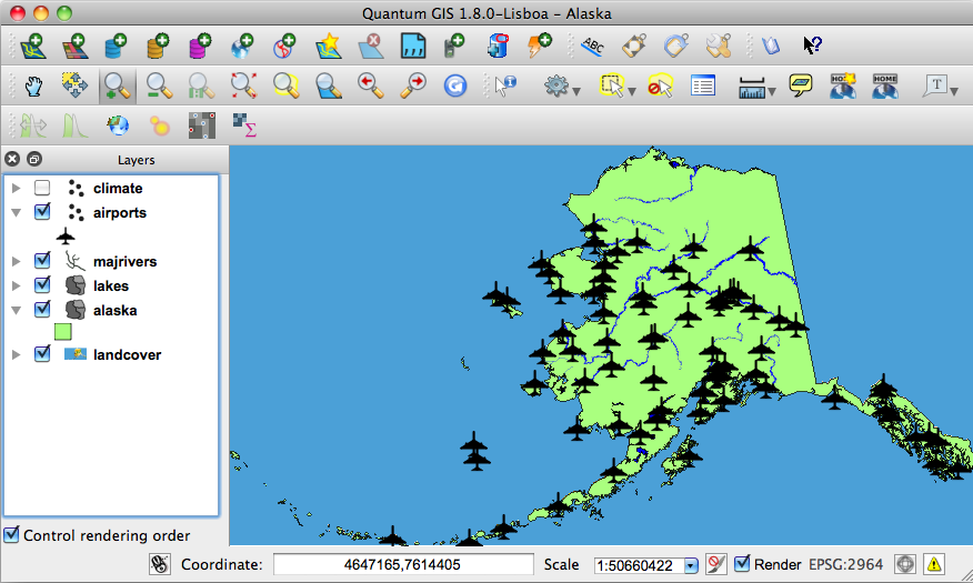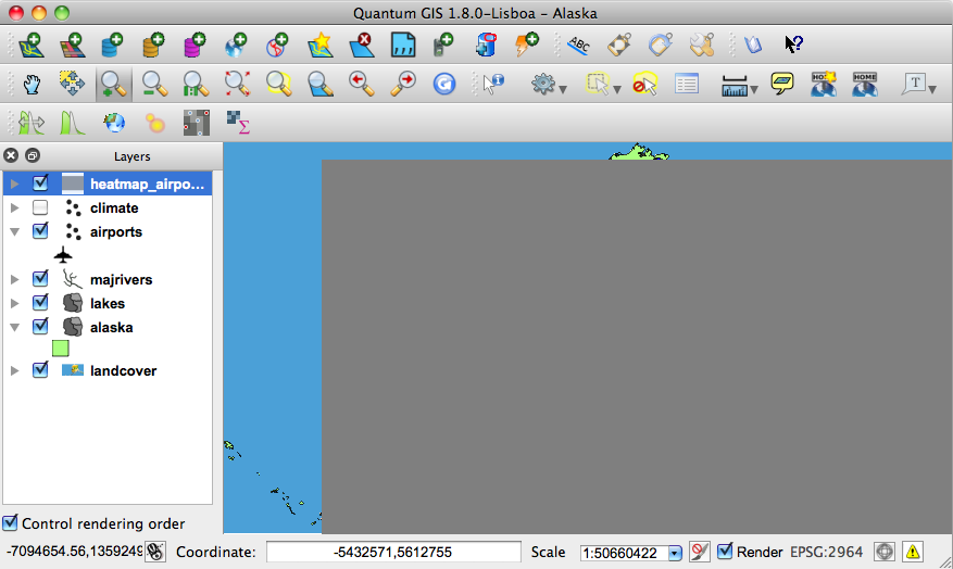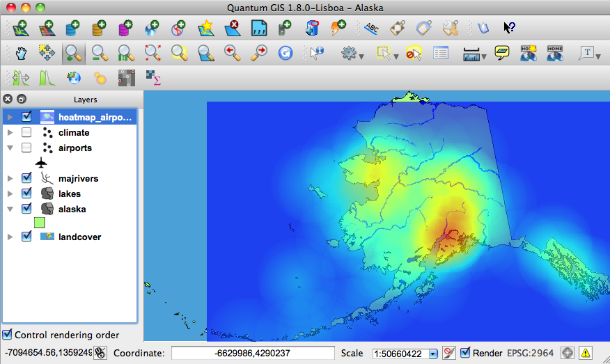 В этом примере будет использован векторный слой airports.shp из демонстрационного набора данных QGIS (см. раздел Примеры данных). Ещё один хороший пример создания теплокарт можно найти на сайте http://qgis.spatialthoughts.com.