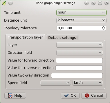 After setting the Time unit, Distance unit and Topology tolerance you can choose the vector layer in the Transportation layer tab. Here you can also choose the Direction field and Speed field. In the Default settings tab you can set the Direction for the calculation.