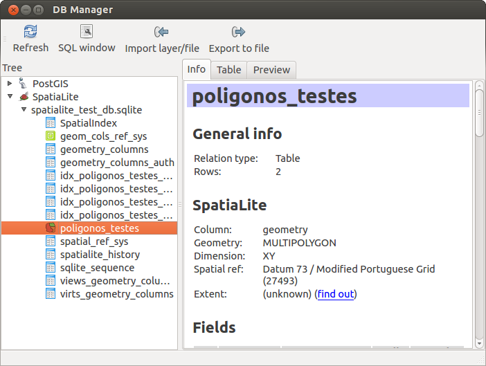 После подключения к базе данных в главном окне модуля становятся доступными три вкладки. Вкладка Info содержит информацию о таблице, типе геометрии, а таже о полях, ограничениях и индексах. Отсюда также можно запустить процедуру «Vacuum Analyze», а также построить пространственный индекс, если он отсутствует. Вкладка Table отображает данные в табличном виде, а вкладка Preview используется для предпросмотра пространственной составляющей.
