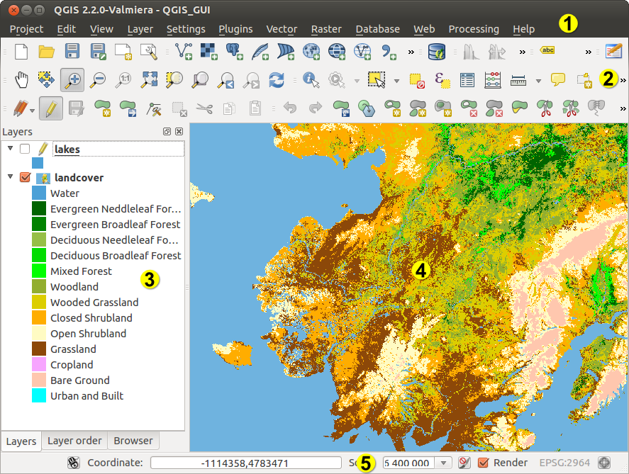 When QGIS starts, you are presented with the GUI as shown in the figure (the numbers 1 through 5 in yellow circles are discussed below).