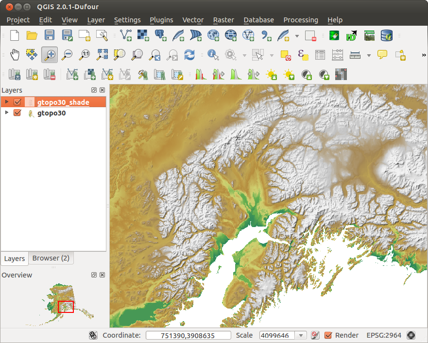 You should now have the gtopo30 elevation with its colormap and transparency setting displayed above the grayscale hillshade map. In order to see the visual effects of the hillshading, turn off the gtopo30_shade map, then turn it back on.
