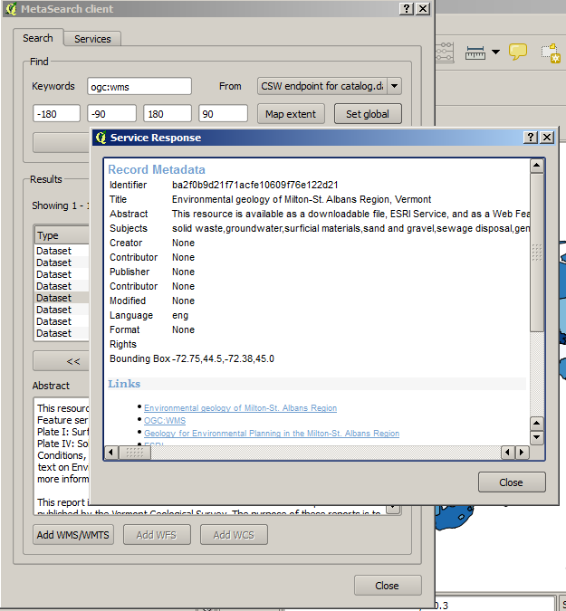 • if the record is an OGC web service (WMS/WMTS, WFS, WCS), the appropriate ‘Add to WMS/WMTS|WFS|WCS’ buttons will be enabled for the user to add to QGIS. When clicking this button, MetaSearch will verify if this is a valid OWS. The OWS will then be added to the appropriate QGIS connection list, and the appropriate WMS/WMTS|WFS|WCS connection dialogue will then appear